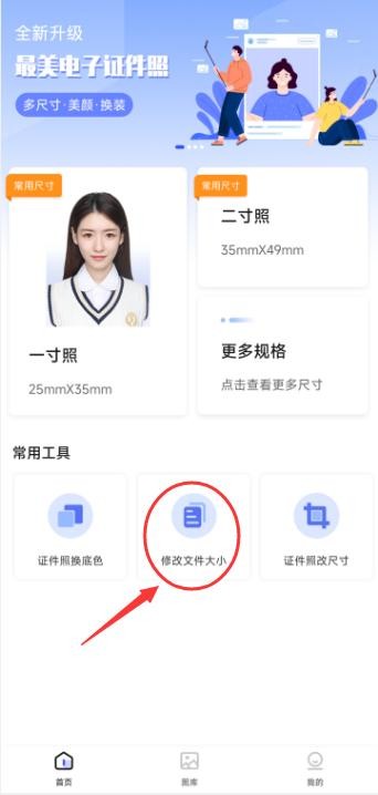 在手机上安装【最美电子证件照】app后打开app,在首页【常用工具】下你可以看到一个叫做【修改文件大小】的功能,这就是我们这次的主角了。
