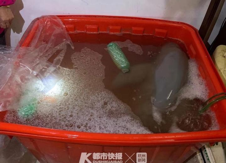 “大鱼”被他养在橙色的塑料水池里,边上放着空气泵,不断给水里打入空气。“大鱼”在水池里扭动身子,偶尔也会抬起头来,探出水面,发出叫声。
