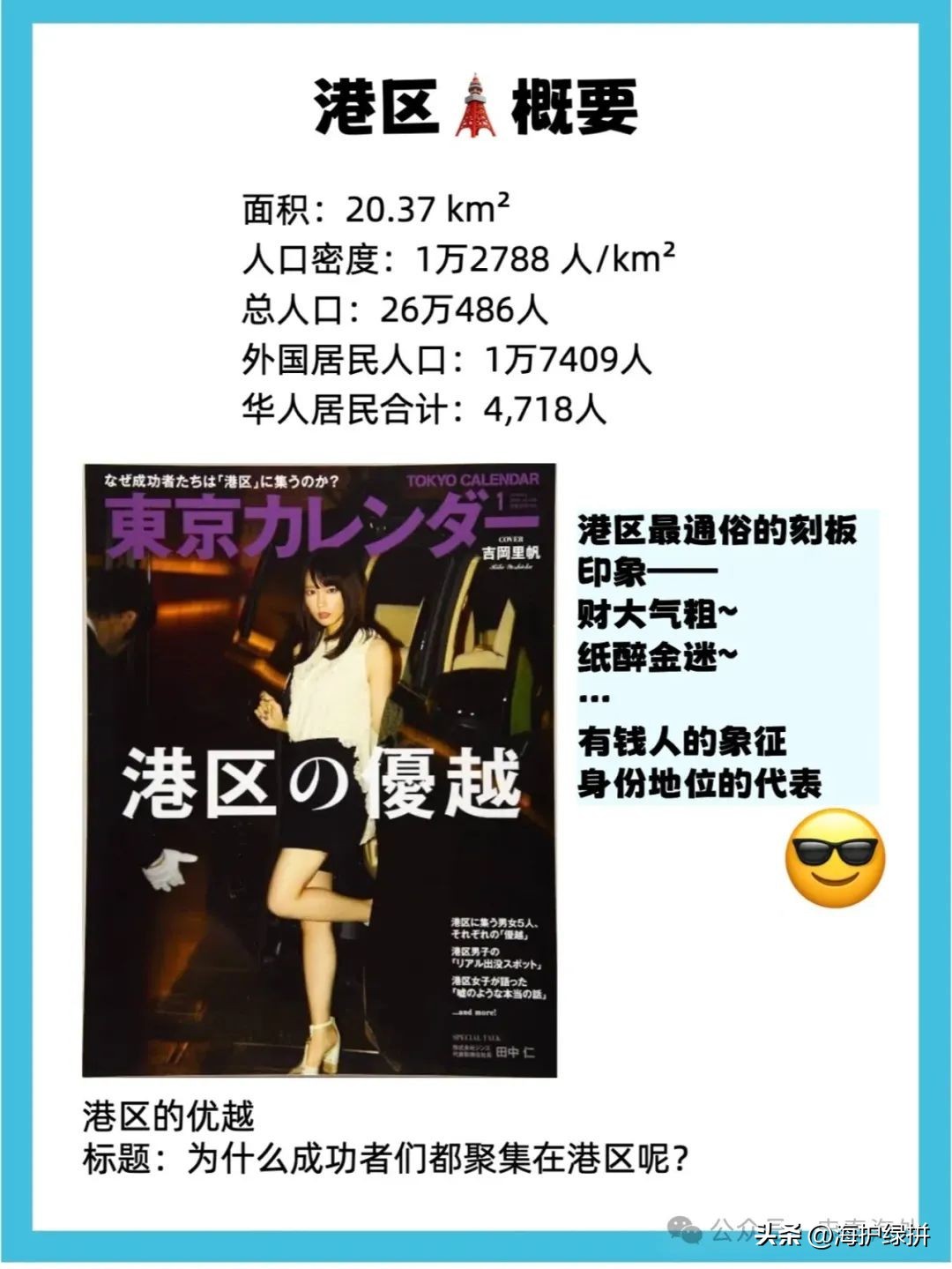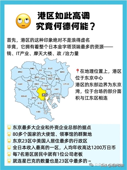 港区-东京23区中国际色彩蕞浓厚的行政区。驻日大使馆与外资企业的大量进驻,让本地的外国人居住者比例达一成之多。
