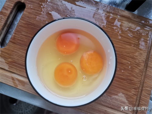 2、碗中打入三个鸡蛋,用筷子搅散,加入一点食用盐调底味。