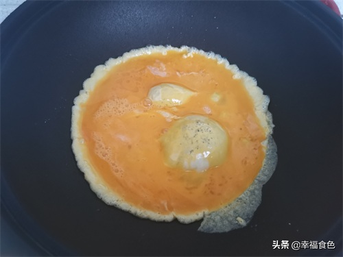4、锅里放入3勺食用油,放入搅散的蛋液。