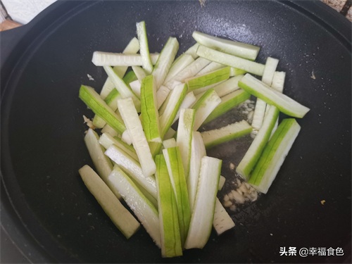 4、丝瓜切好后要马上下锅,不然氧化后就会发黑,可以切好先用淡盐水浸泡,另外丝瓜不可炒的时间过久,不然会出水,而且软烂了也不好看。