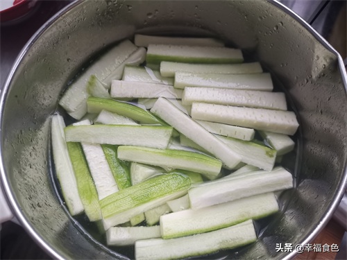 3、丝瓜切成细条状,放入淡盐水里浸泡。防止丝瓜氧化变色。