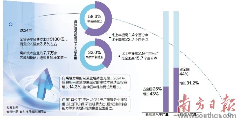 其中,广东高技术制造业、装备制造业增加值占规模以上工业比重分别为32.0%和58.3%,比上年提高2.9个、1.4个百分点,分别比全国高15.7个和23.7个百分点。新能源汽车产量增长43%、占全国1/4;工业机器人产量增长31.2%、占全国44%。