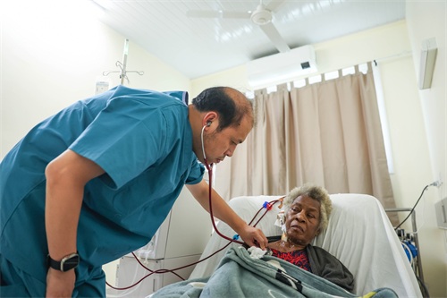 1月2日,在瓦努阿图维拉中心医院,中国援瓦努阿图医疗队副队长、呼吸与危重症医学科医生王睿为患者听诊。