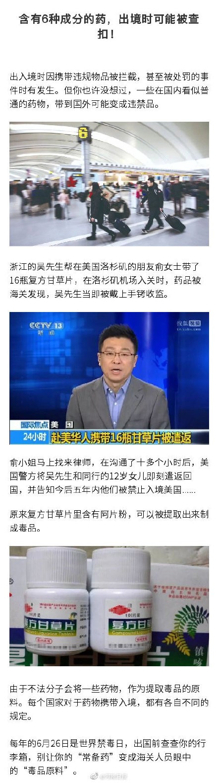 【6类药物成分可“制毒”,出境时千万别携带】吴先生帮美国的朋友带了16瓶复方甘草片,在洛杉矶机场入关时被海关发现,当即被戴上手铐收监。原来,复方甘草片里含有阿片粉,可以被提取出来制成毒品。每年的6月26日是世界禁毒日,我们一起揭晓哪些“常备药”是海关人员眼中的“毒品原料”