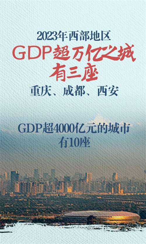 2023年,西部地区GDP超万亿之城有三座:重庆、成都、西安;GDP超4000亿元的城市有10座,既有昆明、南宁、贵阳、乌鲁木齐等省会或自治区首府,也有榆林、鄂尔多斯、绵阳、包头、遵义、曲靖等能源、工业基地。