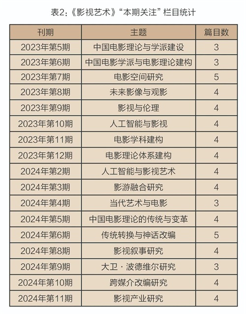 “本期关注”栏目视野更加宽广,聚焦当前影视艺术领域的热点议题与广泛背景,尤其是具有跨学科特质的研究方向。所转载、整合的文章往往是基于时代变革而产生的创新思考和理论拓展,展现出强烈的前瞻性。例如,围绕“中国电影理论与学派建设”“电影学科建构”“电影理论体系建构”等主题,栏目高度关注中国电影学派及学术体系的建立,强调其理论框架的构建与完善。与此同时,“本期关注”还多以跨学科研究趋势为立足点,对影视学术的多元探索进行脉络梳理。从文化与哲学层面的探讨,到技术与新兴媒介对影视的影响,都得到了系统呈现。除此之外,栏目还深入探讨电影与伦理、跨媒介改编、传统转换与神话改编等主题,展示了影视研究所关涉的文化与哲学维度;在较为前沿的研究视野上,栏目也多次聚焦“人工智能与影视”“影游融合”等议题,凸显《影视艺术》在编刊过程中对新兴技术与媒介艺术、影视创作及理论研究影响的敏锐关注。