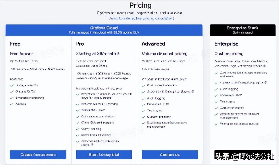 Grafana Cloud有以下三个版本的收费方案,对应的是不同的产品权限、多源支持等。Grafana Enterprise 则是更加定制化的方案,包括更高级的插件、身份验证与安全、支持服务等。