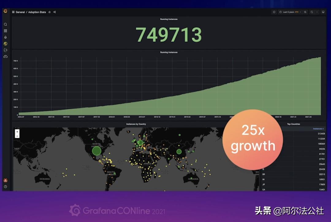 Grafana过去6年时间使用量增长了25倍,达到接近75万的活跃安装数。