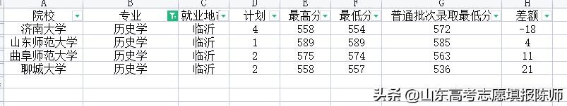 历史学专业也是只有4所院校招生,最低录取分数589——554,聊大的性价比低,高出正常录取21分,而济南大学比正常录取低18分。