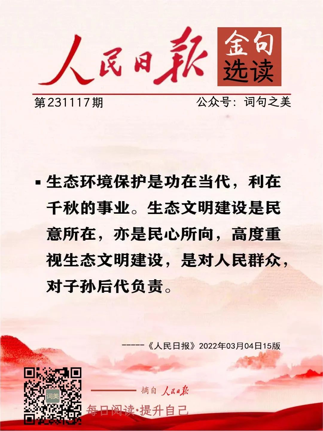 ▌生态环境保护是功在当代,利在千秋的事业。生态文明建设是民意所在,亦是民心所向,高度重视生态文明建设,是对人民群众,对子孙后代负责。一一《人民日报》2022年03月04日15版