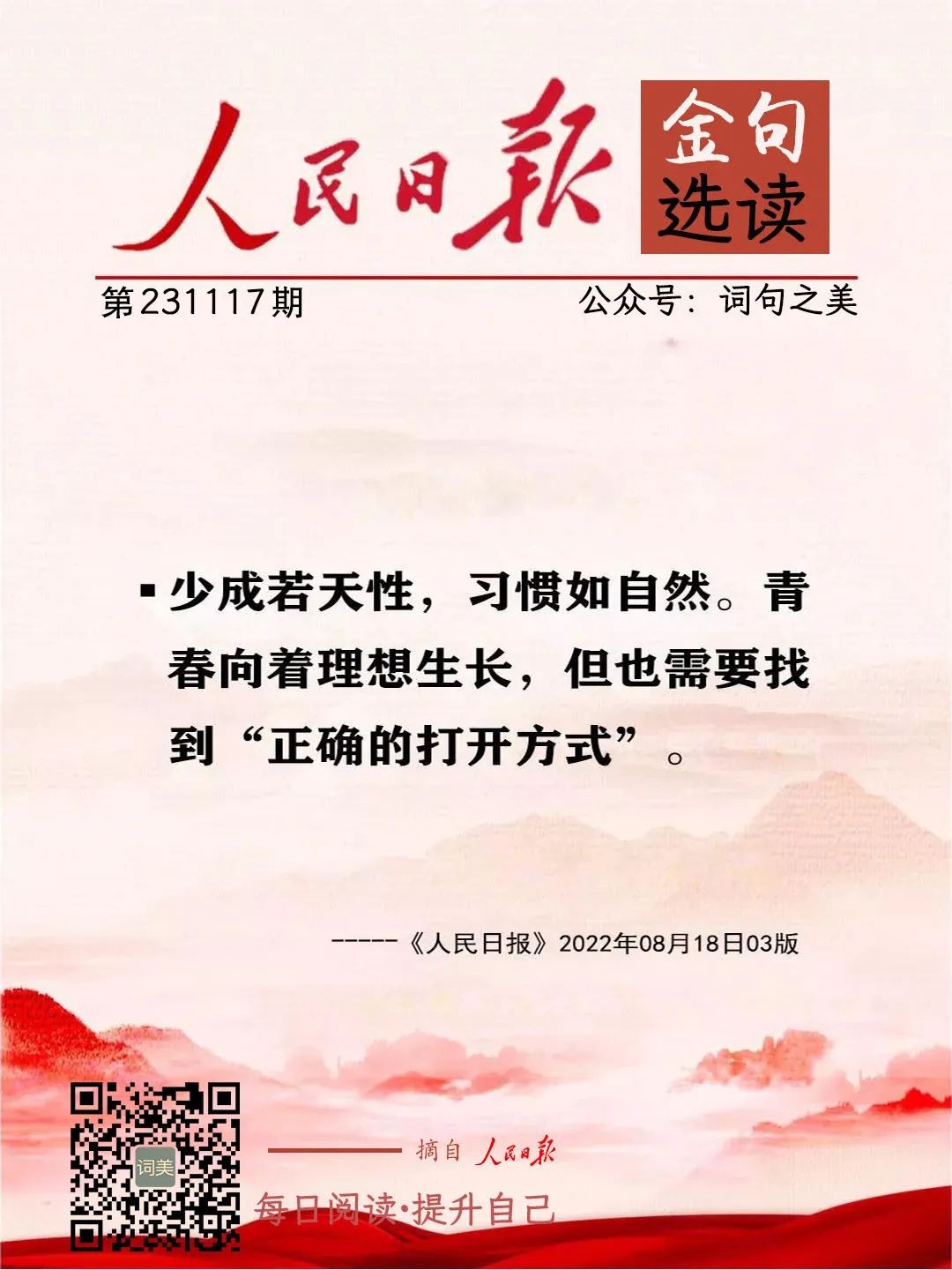 ▌少成若天性,习惯如自然。青春向着理想生长,但也需要找到“正确的打开方式”。一一《人民日报》2022年08月18日03版
