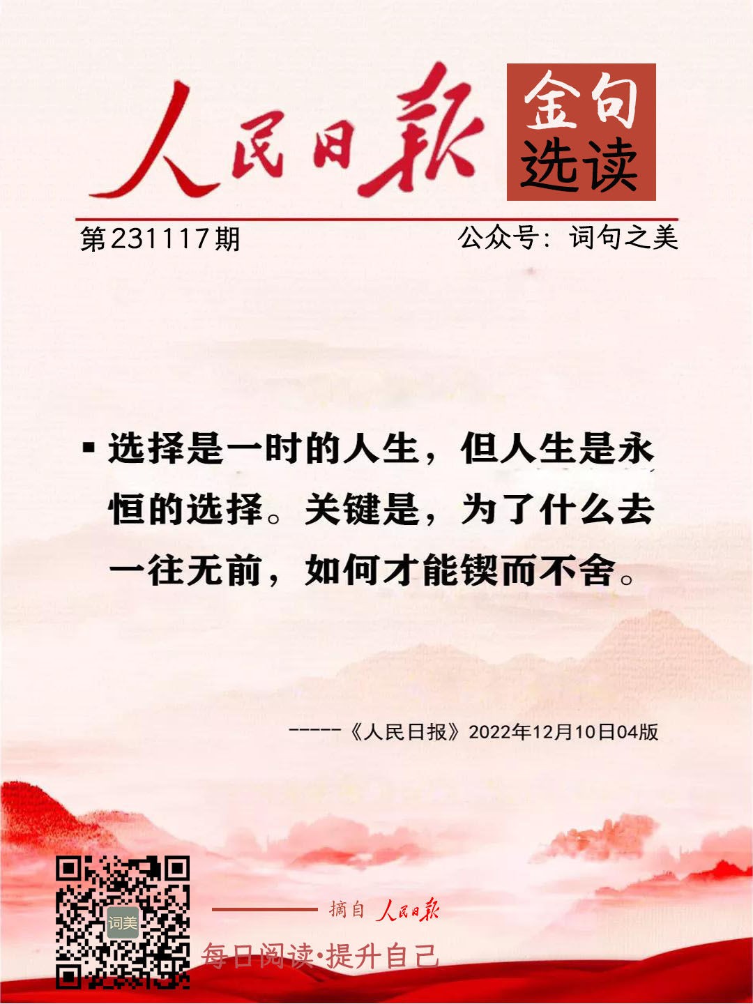 ▌选择是一时的人生,但人生是永恒的选择。关键是,为了什么去一往无前,如何才能锲而不舍。一一《人民日报》2022年12月10日04版