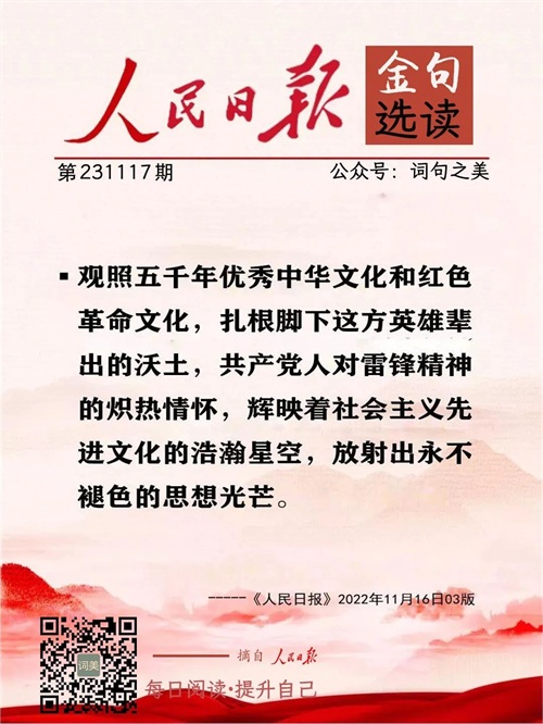 ▌观照五千年优秀中华文化和红色革命文化,扎根脚下这方英雄辈出的沃土,共产党人对雷锋精神的炽热情怀,辉映着社会主义先进文化的浩瀚星空,放射出永不褪色的思想光芒。一一《人民日报》2022年11月16日03版