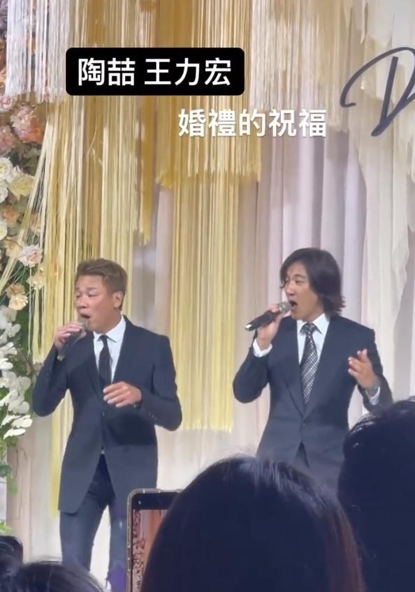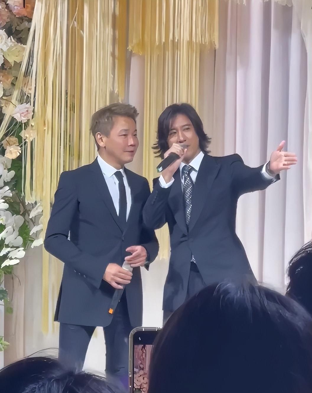 46岁的王力宏,一头长发,在婚礼上和陶喆一起为新人献唱祝福。