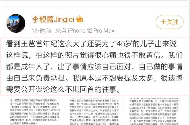 果不其然,不久之后,李靓蕾就放出“大招”,再度戳穿了李父的谎言。明里暗里,讽刺王力宏是“巨婴”,没担当,出事儿了就将父亲推出来扛事儿。