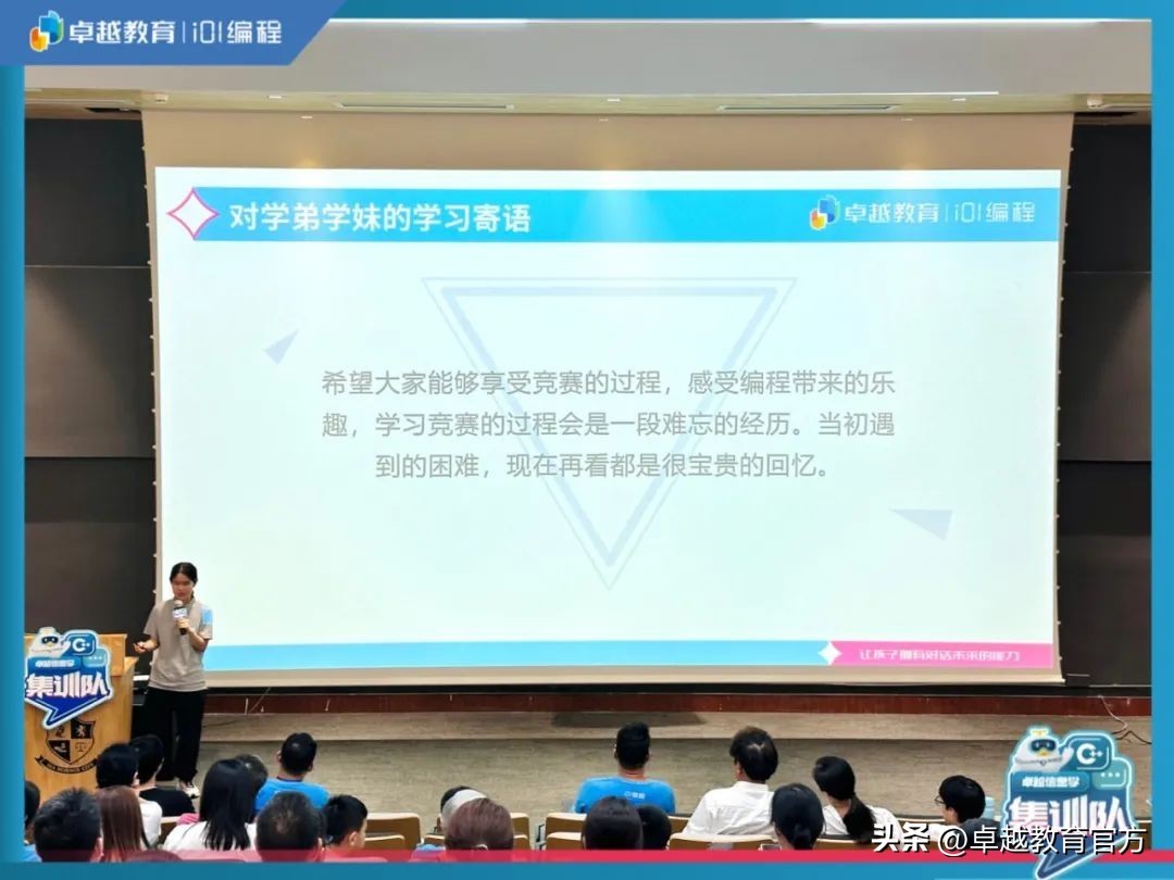 此次信奥CSP集训营开营仪式上,不仅有资深竞赛教练解读入营的目标和营地安排,更有大咖助阵,分享信奥学习心得及建议,共同为卓越i01编程CSP集训营的学生们保驾护航。