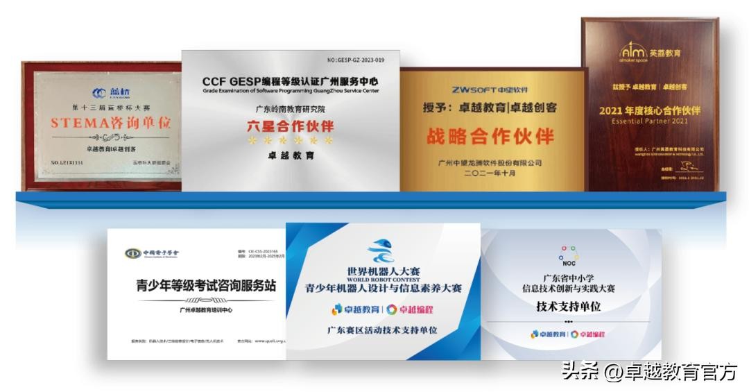 除了学员亮眼的成绩单,卓越i01编程也备受业界认可。目前,卓越i01编程已成为信息学奥赛主办单位—中国计算机学会(CCF)授权服务中心最高星级合作单位,同时也作为由工信部直属单位广东省电子学会(CIE)主办的世界机器人大会青少年机器人设计与信息素养大赛(广东赛区活动)、广东省中小学信息技术创新与实践大赛、蓝桥杯大赛3个省级白名单赛事的技术支持单位。