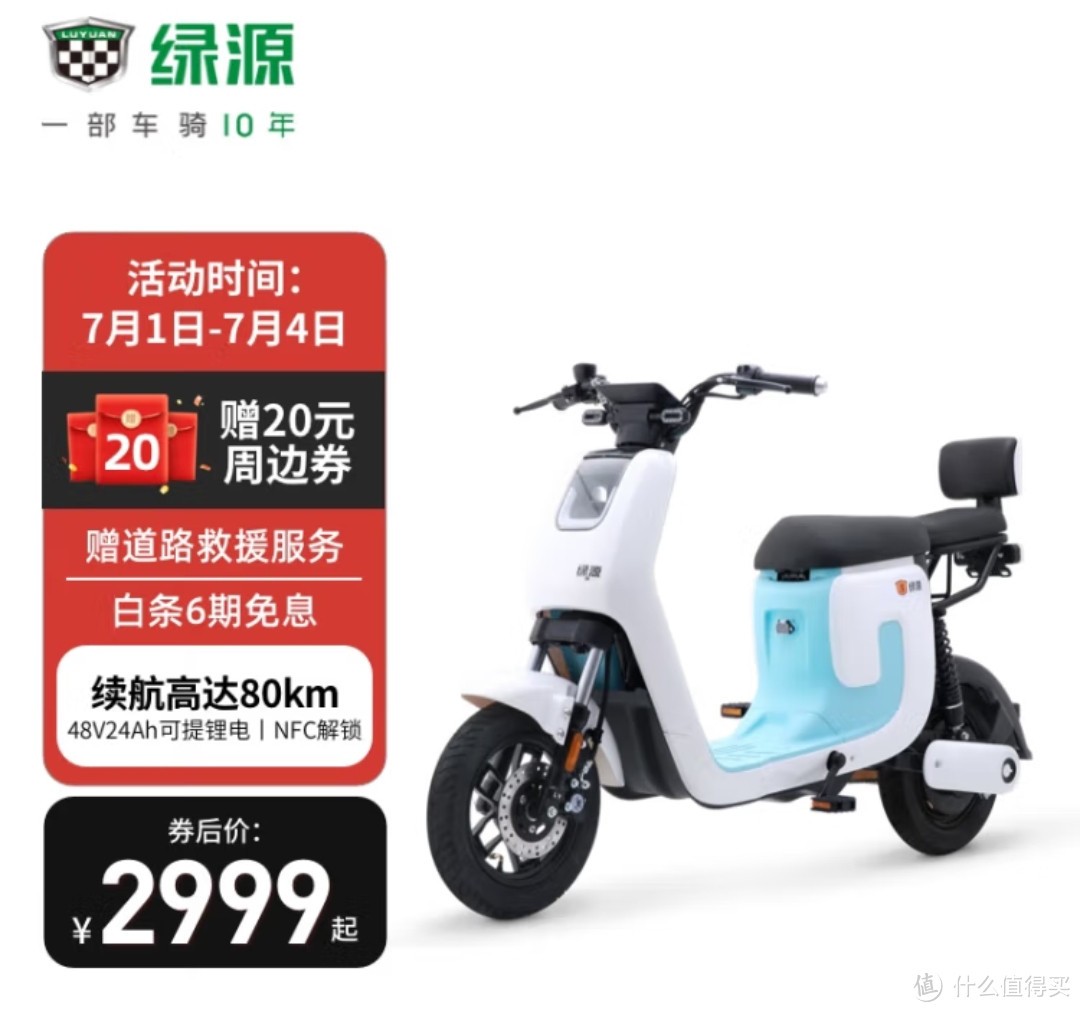 我觉得如果你想买一款绿源入门级别的可提锂电池电动车,这一款目前性价比最高,当然618期间我会推荐价格2600左右的K5。它的电池容量为20Ah续航70km,可以满足日常基本需要。另外它还有NFC钥匙,车篮后座等配件也齐全,整体性价比不错: