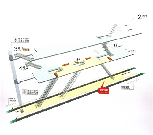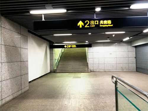下图是在复兴岛站的站台通向下层站厅的地方,指向是2号出口,也就是是直通上海地铁12号线复兴岛站上层站厅的电梯。