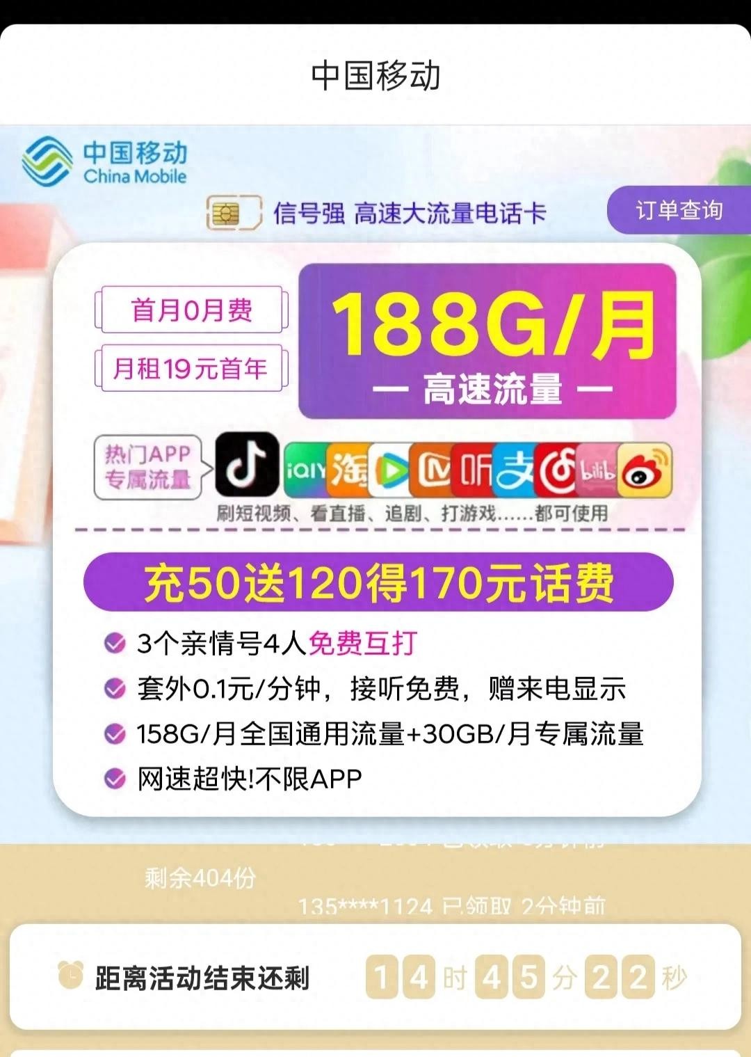 中国移动推出超值新套餐:188G月流量不限速,仅需19元月租!