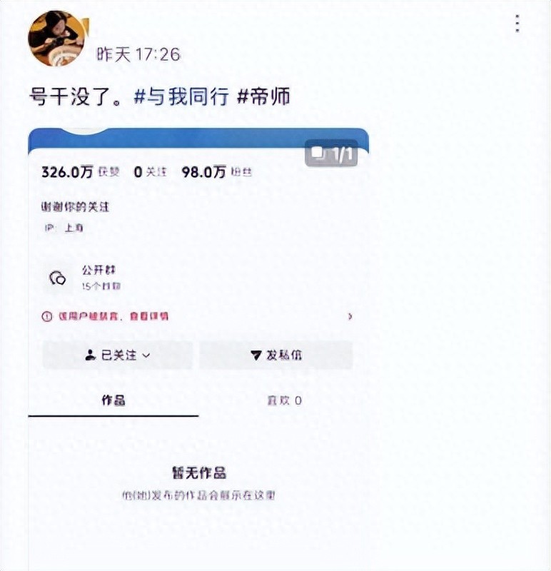 2月27日,一位网友在早晨上网时惊愕发现,自己的偶像帝师的账号竟然被封禁,起初以为是谣言,深入查看后才确认了这一令人震惊的消息。显而易见,这一次的封禁并没有像aka那样逐渐退场,而是直截了当地遭受了更为严厉的惩罚。