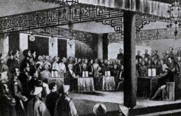 1858年,清朝与英法美签订《天津条约》。1859年6月僧格林沁在大沽口大胜前往北京换约的英法美联军,又让美国公使按照清朝要求换约成功。胜利让咸丰帝宣布大为振奋,宣布之前签订的《天津条约》失效,要么按照美国的方式另订新约,还不能到北京,只能在海上。
