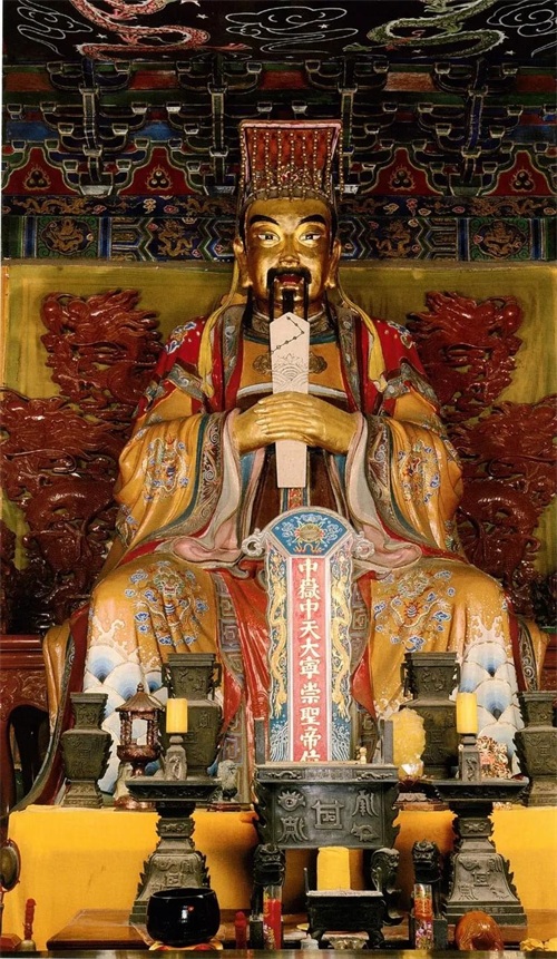所以,咱们认为的位居中央的老大哥,其实比其他四位,反而出现的时间要晚不少。说回中岳大帝,他是嵩山之神,全称叫中天大宁崇圣帝。据《云笈七签》卷七称:“中岳嵩高君,领仙官玉女三万人,服黄素之袍,戴黄玉太乙之冠,佩神宗阳和之印,乘黄龙,从群官。”