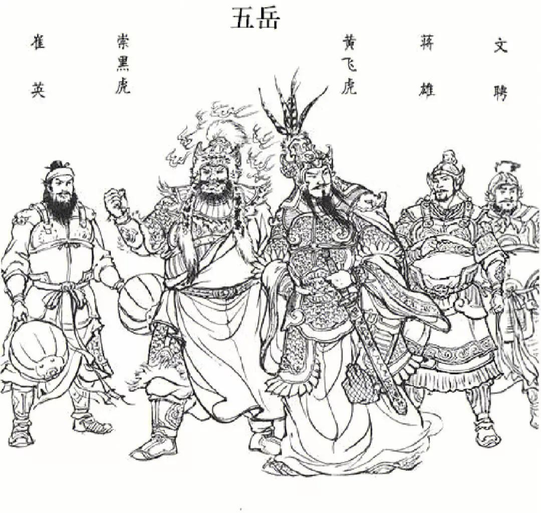 五岳大帝有诗为证:杀气迷空千里长,旌旗招展日无光;层层铁钺锋如雪,对对钢刀刃似霜。人胜登山豹虎猛,马过出水蟒龙钢;渑池此际交兵日,五岳齐遭剑下亡。――只杀得愁云惨淡,旭日昏尘,征夫马上抖精神。号带飘杨,千条瑞彩满空飞,剑戟三差,三冬白雪漫阵舞。崇黑虎双板斧,纷绁上下;闻聘的托天叉,左右交加。崔英的八楞锤,如流星荡漾;蒋雄的五爪抓,似蒺藜飞扬。黄飞虎长枪如大蟒,虎翻腾刀;架斧,斧劈刀,叮当响,出穴好;张奎战五将,似猛虎,叉迎刃,刀架叉,有叱吒之声,锤打刀,刀架锤,不离其身。抓分顶,刀掠处,全凭心力;枪刺来,刀隔架,纯是精神。五员将,鞍鞒上,各施巧妙;只杀得刮地寒风声拉杂,荡起征尘飞镫甲。渑池城下立功勋,数定五岳逢七煞。――五将东征会渑池,时逢七煞数应奇;忠肝化碧犹啼血,义胆成灰永不移。千古英风垂泰岳,万年烟祀祝嵩尸;五方帝位多隆宠,报国孤思史册垂。