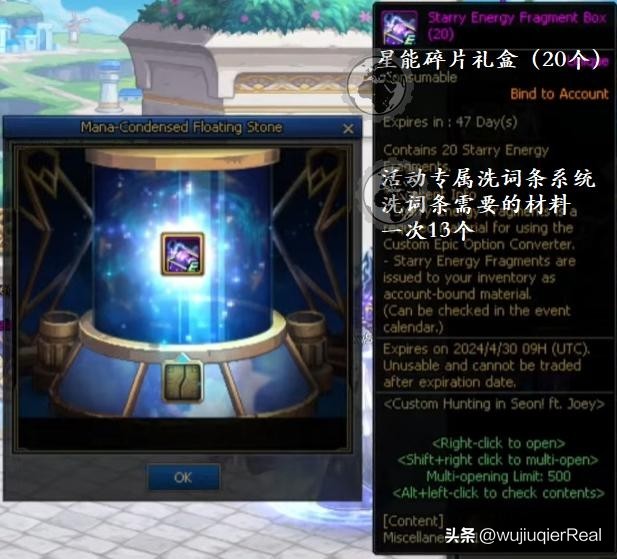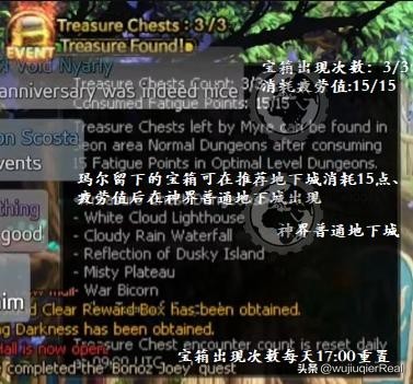 在推荐地下城消耗15点疲劳值后下次进入神界普通地下城,会出现特别宝箱,破坏后可掉落神界访客硬币若干和浓缩魔力悬浮石。打开浓缩魔力悬浮石可以获得随机奖励,有几率出现星能碎片。星能碎片可用于本活动专属的词条变换系统。