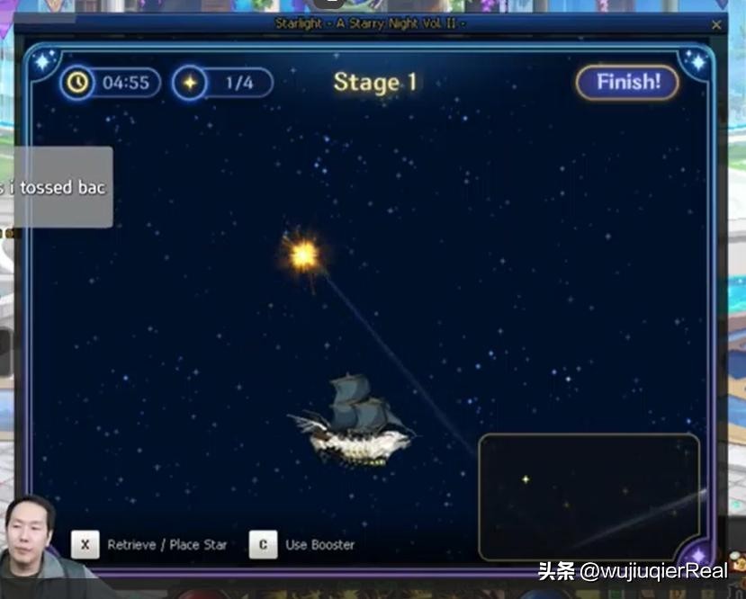 这是九周年庆第一弹的小游戏活动。您需要开一条小船在限定的时间内收集星星,并放置到正确的位置拼接成一个完整的星座。按X键捡起星星或放置星星,按C键使用跃迁装置(跃迁技能可用于从黑洞逃脱或回避闪电)。界面右下方有雷达可查看。