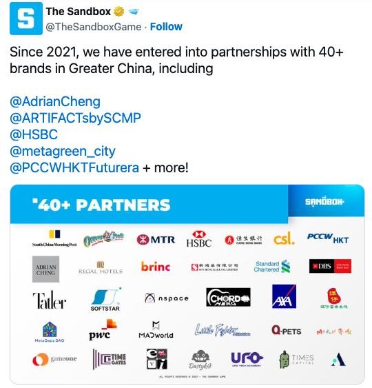自2021年公测以来,Sandbox已经吸引了40+大中华区的著名品牌入驻