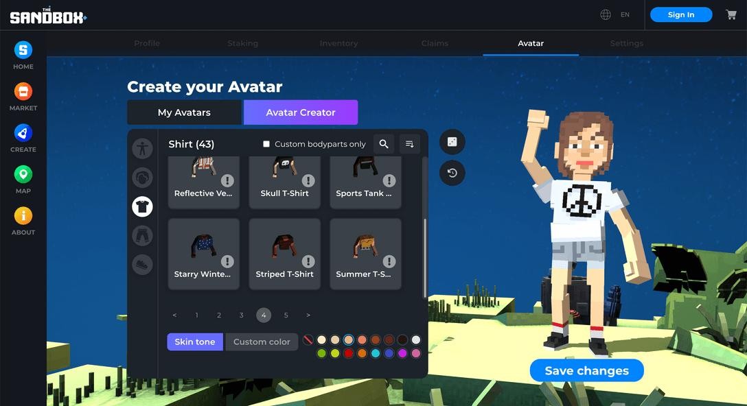 你可以免费创建你的头像,可以做一个像自己的,或者做任何你想要在这个虚拟世界中看到的版本。Sandbox 还允许你购买衣服和配饰等资产,来让你的头像看起来更接近你想要的那样。