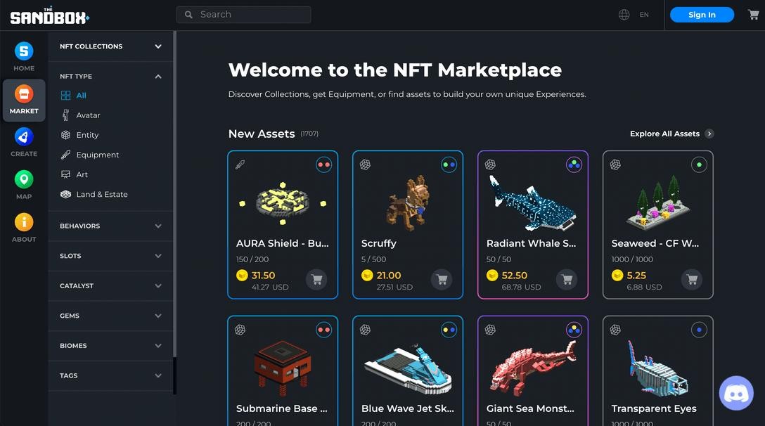 你可以在 Sandbox 官方市场以及 OpenSea 等二级市场上找到并购买你喜欢的游戏内 NFT 。