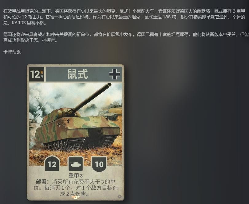 值得一提的是,《KARDS》将在11月28日迎来全新冬季拓展包——“血与铁”。本次拓展包着重于二战时期的装甲战与坦克主题,喜欢钢铁巨兽的玩家们有福了,诸如黑王子、鼠式、T34等传奇坦克都将加入《KARDS》的战斗,是时候让那些迫击炮教徒见识一下,谁才是掌管战场的火力之王。