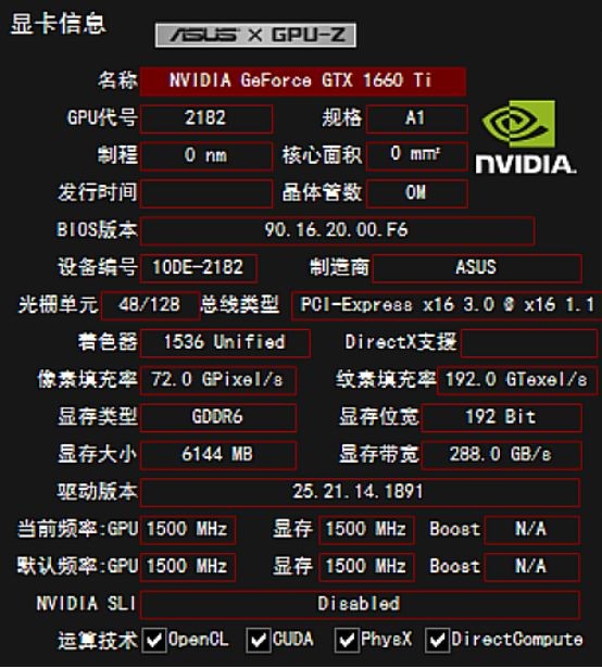 华硕这款GTX1660Ti的芯片编号为TU116-400-A1