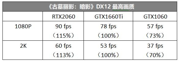 《古墓丽影:暗影》包括了DX12模式,可以看出采用图灵架构的RTX2060与GTX1660Ti差异基本上就来自规格的差异,而采用帕斯卡架构的GTX1060与GTX1660Ti的差异就不止来自CUDA单元、显存带宽等硬规格,架构差异把这个差距拉得更大了。可见图灵架构在未来跟多的DX12游戏中表现会更出色。