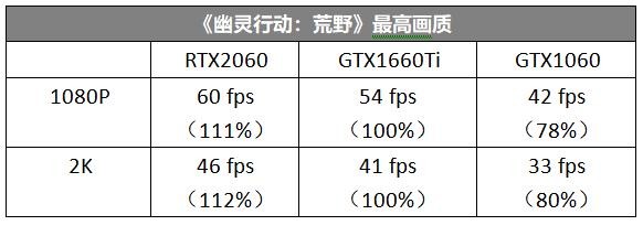 《幽灵行动:荒野》测试项目对硬件的要求也比较高,1080P最高画质下三款显卡中也只有RTX2060能保持60fps,当然GTX1660Ti的差距也不大,小超一把也能突破60fps门槛,而GTX1060就被甩得比较远了。2K分辨率下,GTX1660Ti和RTX2060都能突破40fps,而GTX1060离40fps还有点远。