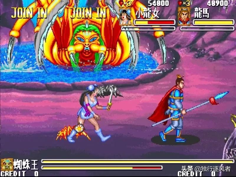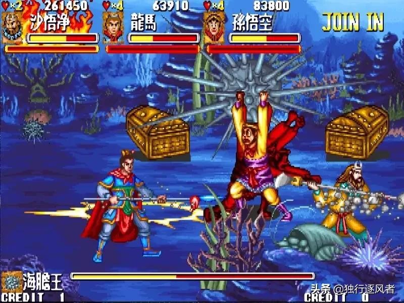 这款游戏在街机里最大的乐趣就是可以四个人玩,好爽。孙悟空比较多人选,白龙马也不错,他们的属性大招至今都还记得,凸木功、天宫火、地道功、冰火掌、无影刀,还有宝物系统以及合体技能,过关抢东西吃,积累的武器留着干大BOSS。