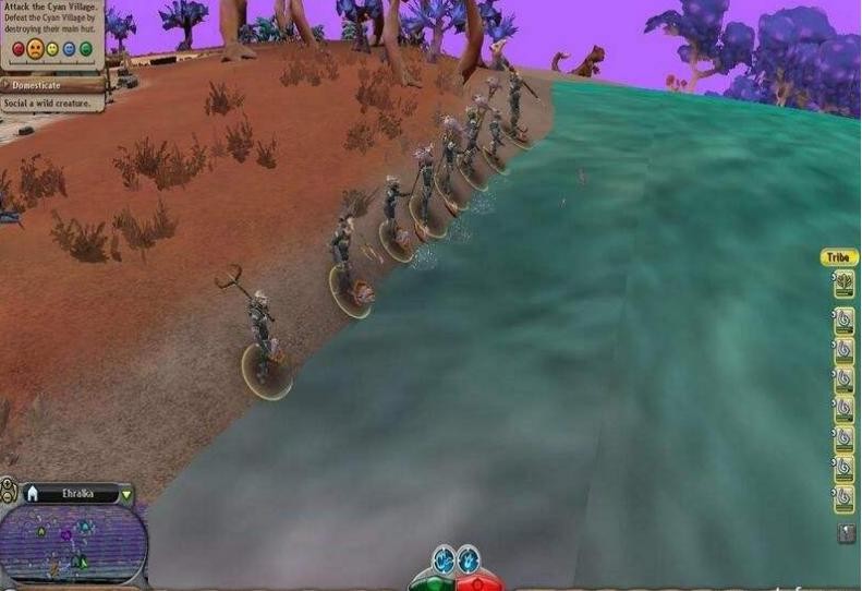 提升部落的人口和武力,向其它部落发起联合或进攻。毁灭了其它部落可以获得它们的食物资源,食物资源能增加建筑、提升人口、获得更高级的武器,而且在部落阶段还可以进行渔猎、圈养生物等,甚至在生物阶段时候的1000血史诗级巨兽你一样可以实现猎杀。