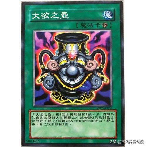 强欲之壶基本上是人人皆知的卡片,在动画中必定人手一张,在困境的时候能很好的补充手卡带来奇迹。整体形象是一个长相极其猥琐,一口大黄牙的壶的形象,也就是这样的形象,能让人感觉到无休止的欲望。
