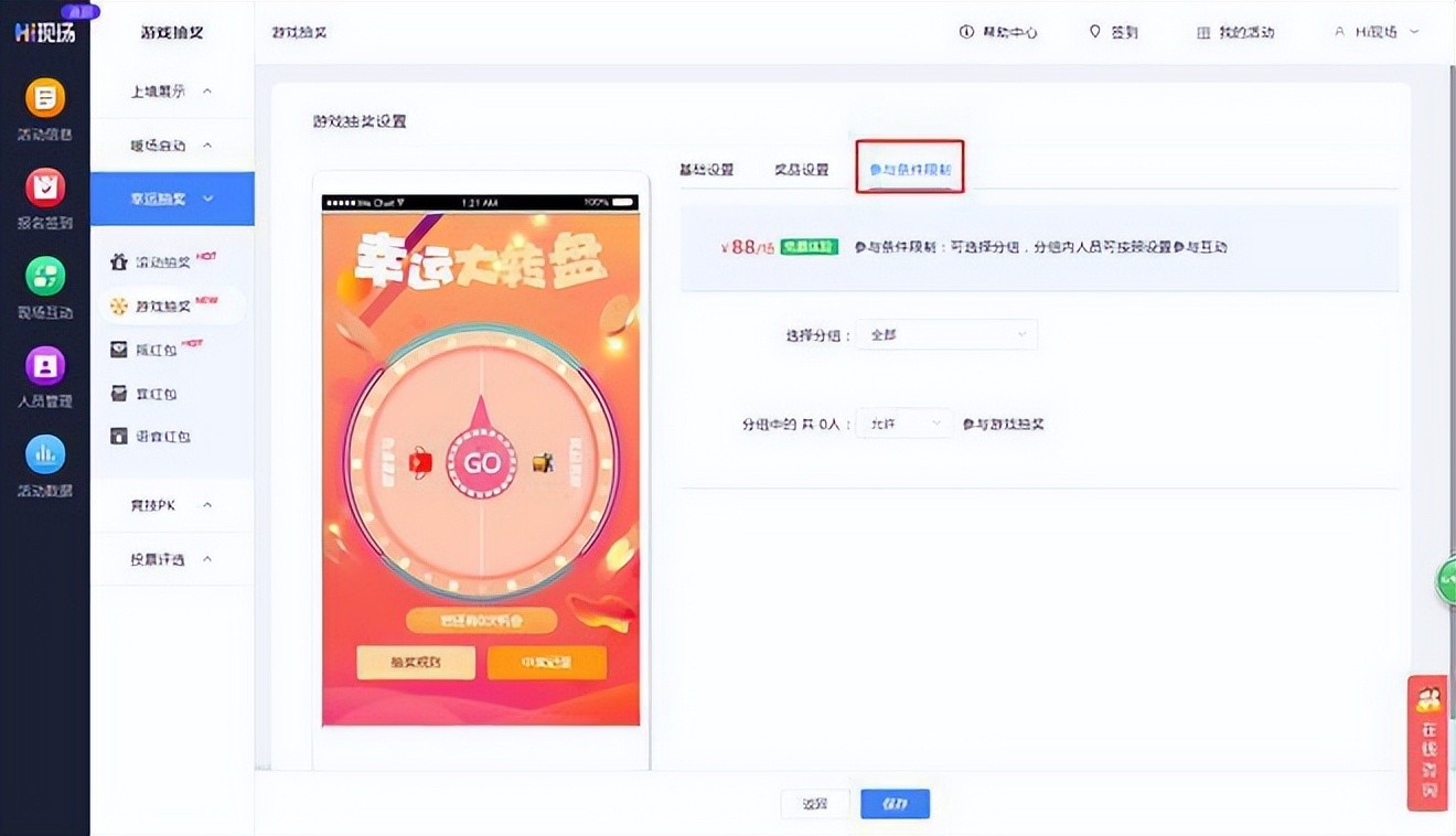 3.参与条件限制:可将参与者进行分组,并设置允许或禁止分组内人员参与抽奖