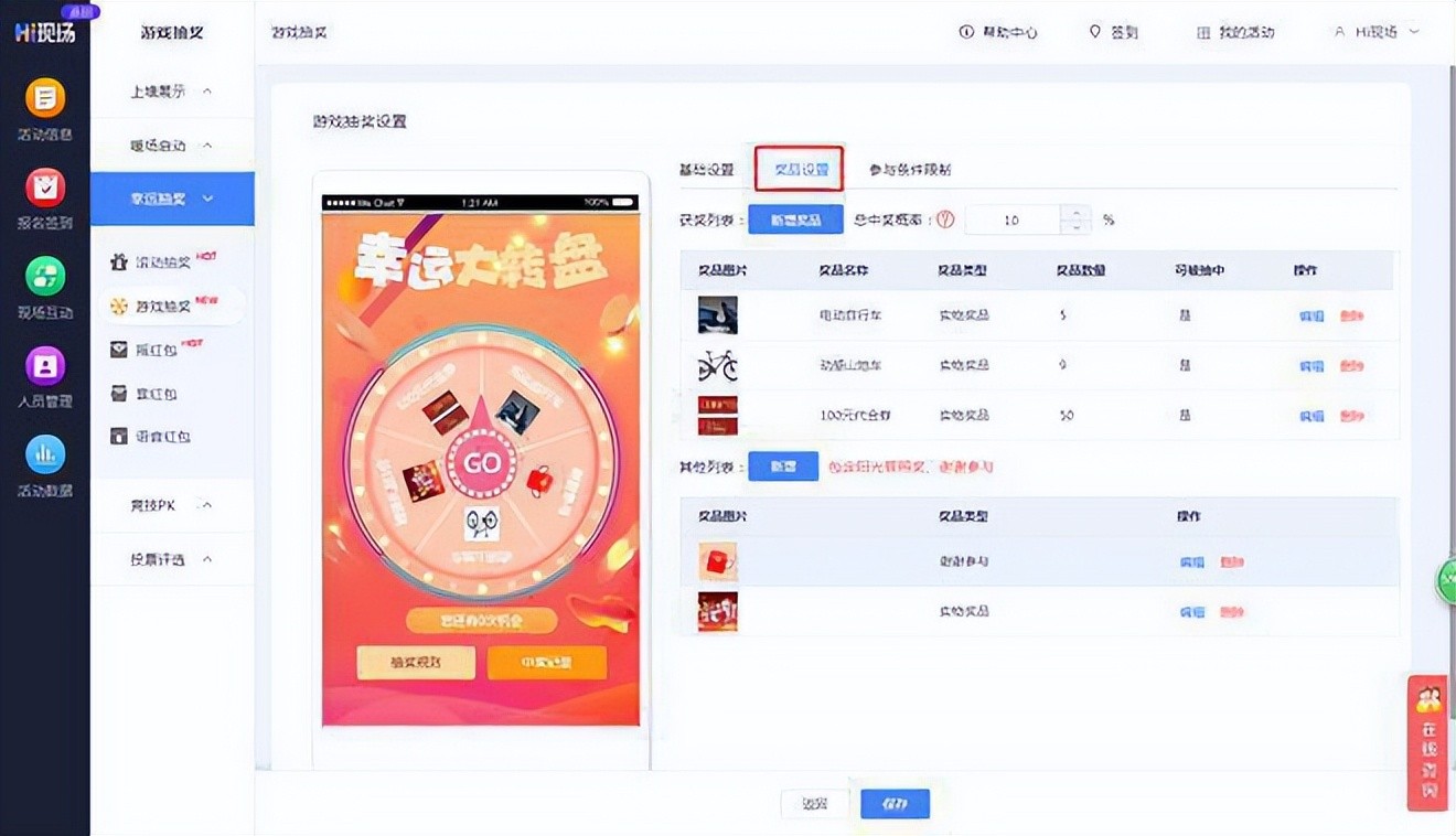 2.奖品设置:可添加现金红包或实物奖品,并且可以设置中奖概率