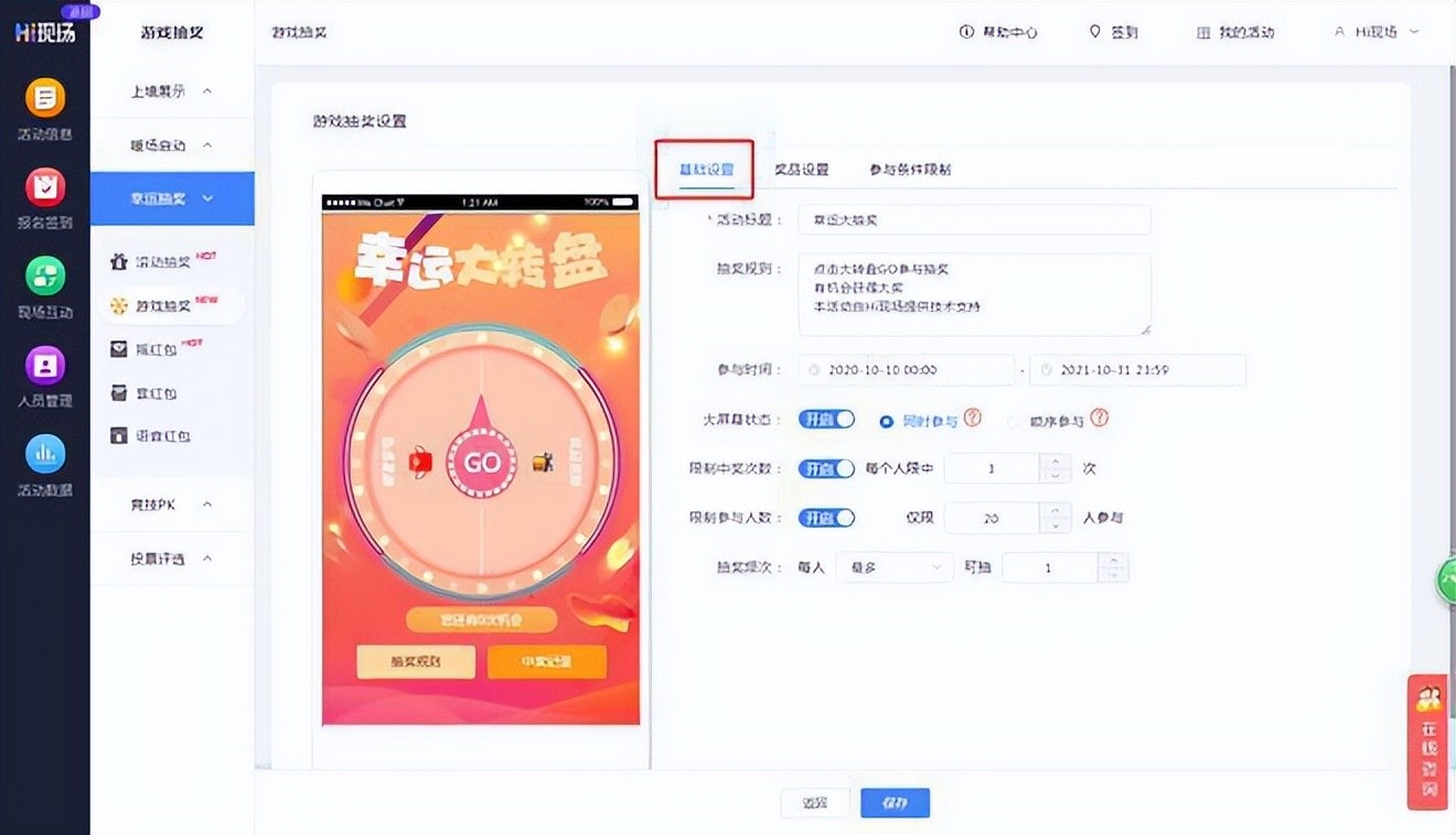 1.基础设置:可编辑活动标题,设置抽奖规则、参与时间、限制条件等
