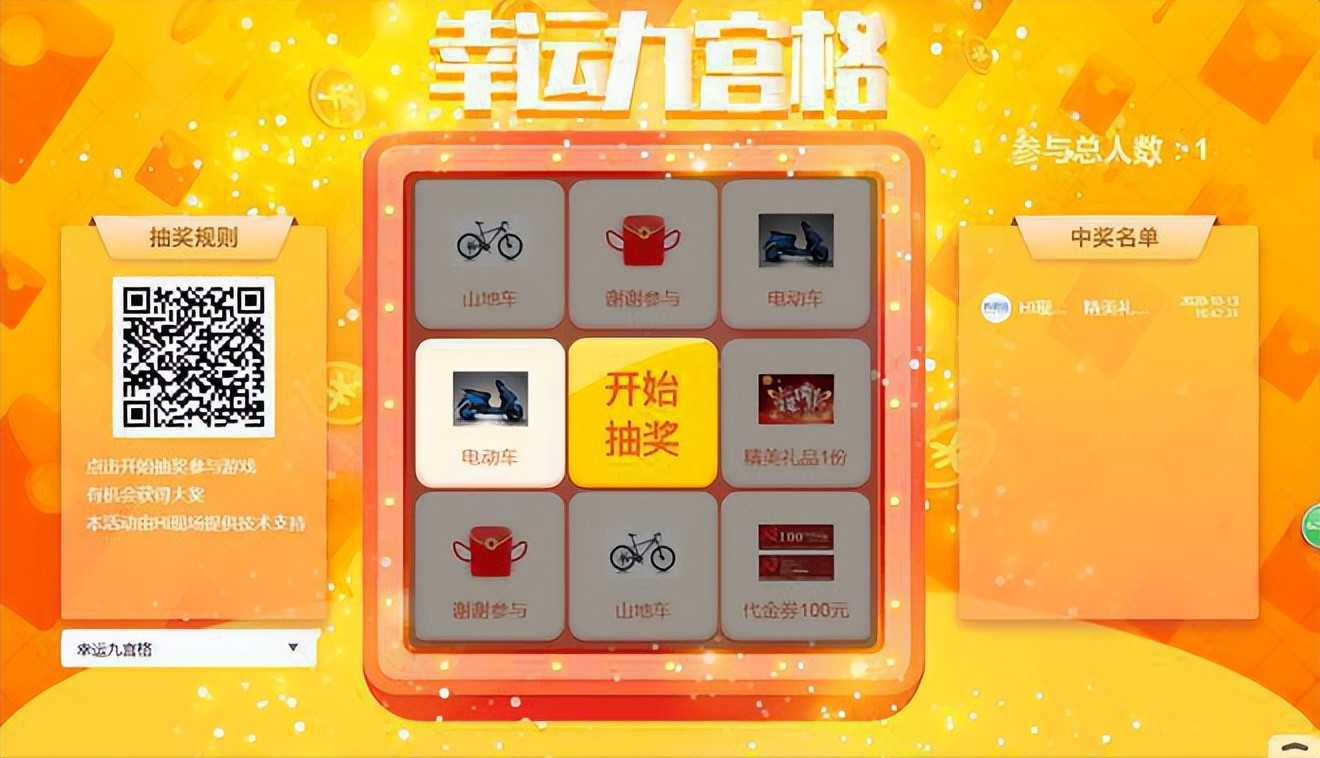 主办方使用游戏抽奖,选择九宫格或大转盘,举行线上线下抽奖活动,抽取中奖信息。
