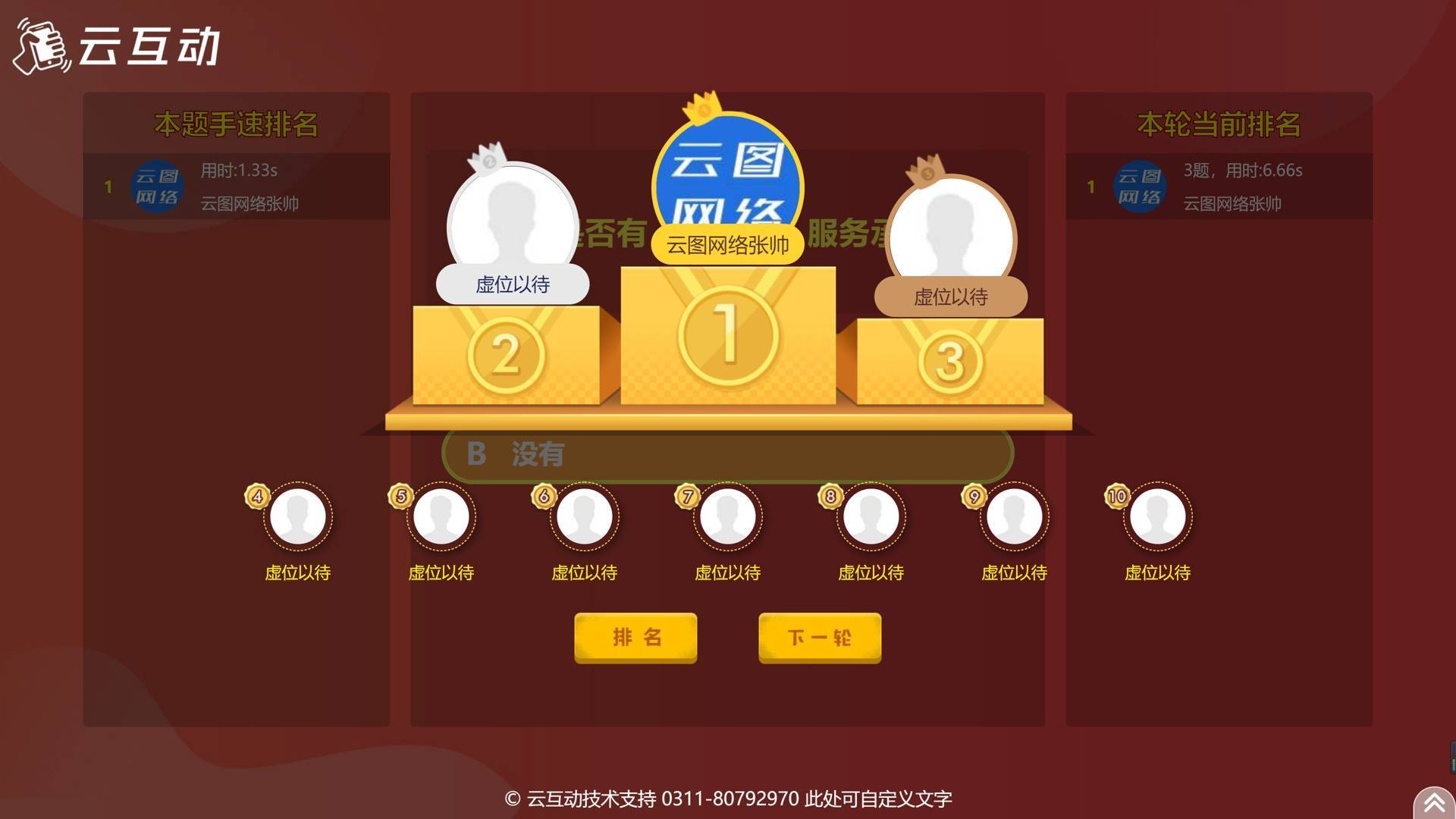 所有人同时扫码参与比赛答题,看谁在同一时间内答对题目数量最多,用时最短题目内容自己可以灵活导入设置。