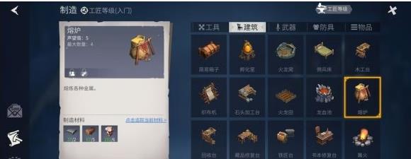 从博克村回来后我们就可以学会【熔炉】的配方了,熔炉是制作各种金属锭所需的功能建筑,在后期需要制作高级武器时会大量需要用到金属锭,因此还会需要制作多个熔炉,建议可以先制作2个来满足需求。