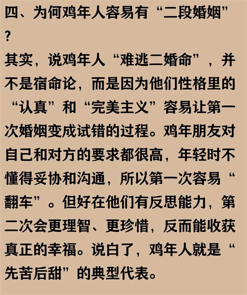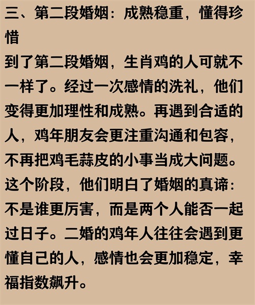 正文内容均有真实数据来源作为参考:根据《2022中国婚姻家庭调查报告》数据显示,属鸡的人在婚姻中因为性格直率、追求完美,导致第一段婚姻中沟通摩擦较多,离婚率略高于平均水平,尤其是在30-40岁之间达到高峰。不过,二婚后大部分属鸡的人能吸取教训,更懂得包容和珍惜,婚姻幸福感提升明显。其实,感情路上多点成长和理解,幸福未必只能靠“二婚”来实现。数据来源:中国社会科学院社会学研究所《2022中国婚姻家庭调查报告》。