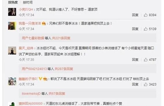 今天祁天道直播期间跟着的小弟说错话了有个小明星骂天道随口说了李冰冰的名字,然后道家军就去李冰冰微博骂她。最后天道不知道怎么直播也没开了。俩人评论里都是节奏。李冰冰躺着中枪。